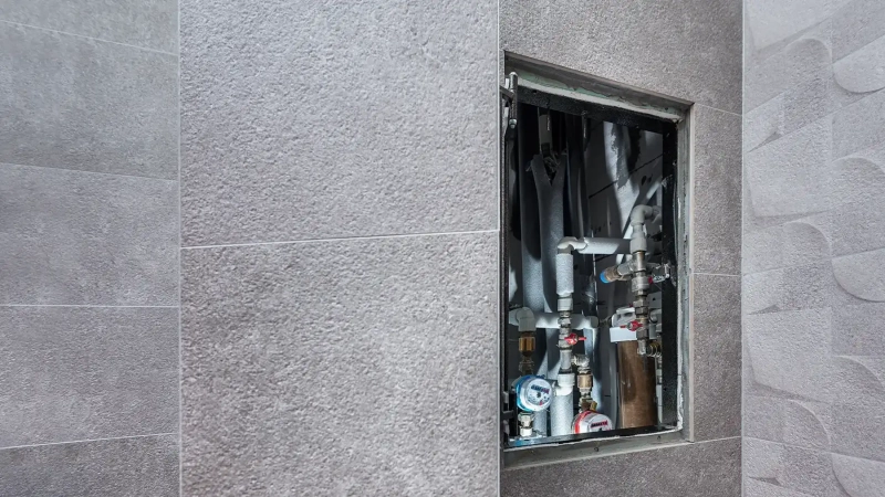 На уровне коллекторного узла и фильтров в коробе или стене делают проем и устанавливают в него люк. После этого отделывают тем же материалом, что и весь санузел. Иногда фронтальную поверхность выделяют с помощью рельефных панелей из экополимера.