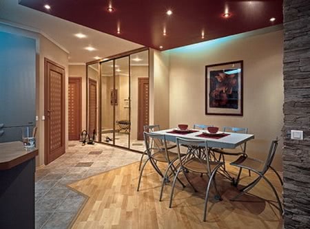 Если столовая располагается там же, где и кухня, перед вами встает задача обустройства многофункционального помещения, разграниченного на рабочую и обеденную зону. Граница между двумя пространствами может быть выполнена с использованием разнообразных дизайнерских приемов. К примеру, арочный проем способен не только обозначить границу между функциональными зонами, но и визуально расширить помещение. Другими возможными способами разграничения двух зон являются многоуровневые потолки, раздвижные двери и перегородки, ступеньки на полу. Кроме этого, можно использовать различные по расцветке и фактуре материалы, что является не только эстетичным, но и удобным, так как для рабочей зоны, где происходит готовка и, следовательно, часто необходима влажная уборка, лучше подойдет плитка, линолеум или моющиеся обои. А для обеденной зоны хорошим решением будет ковровое покрытие, ламинат и текстильные обои.