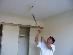 Во время покраски потолка время от времени поворачивайте кисть вокруг своей оси, иначе ее щетина будет неравномерно изнашиваться, образуя так называемую «лопатку», то есть щетину, сточенную с одной стороны.