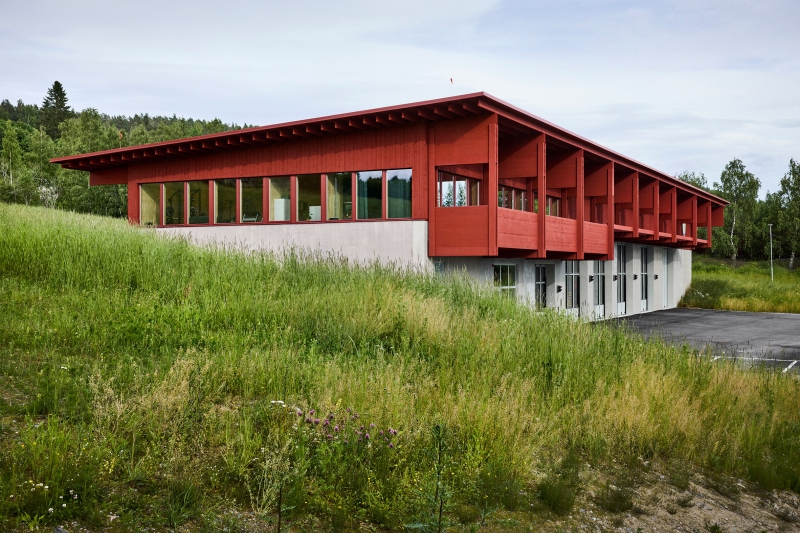 Основание здания, вписанное в ландшафт, выполнено из бетона, а верхний уровень — из клееной древесины (клееного бруса). Архитекторы Kod Arkitekter оставили конструкцию из клееного бруса открытой, чтобы придать фасаду ритмичность. По словам представителей Kod Arkitekter, использование бетона и дерева отражает «намеренно ограниченную палитру материалов и цветов».